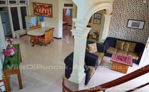 Villa 354 Puncak memiliki faslitas dan interior yang bagus. Ruang kumpul keluarga yang menyatu dengan ruang makan. Terdapat sofa empuk dekat dengan pintu masuk. Fasilitas berupa TV, karaoke dan juga sambungan Internet wifi tersedia disini. Villa ini memiliki setengah bangunan lantai atas yang ruangannya terbuka dengan lantai bawah. Di lantai atas tersedia ruangan dengan sofa tepat di depan pintu teras.