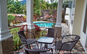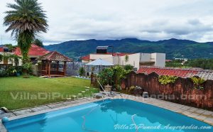 Di sebelah area fasilitas meja biliar yaitu di pekarangan villa terdapat kolam renang berukuran cukup besar dengan meja dan tempat duduk khas pinggir kolam renang. Area ini juga memiliki halaman rumput yang cukup luas dilengkapi gazebo disalah satu sudutnya.