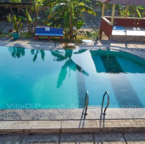 Villa Hoshima di puncak memiliki fasilitas kolam renang yang terletak di pekarangan belakang villa. Kolam renang yang tersedia berukuran cukup besar dan memiliki pemandangan terbuka. Di sisi kolam renang tersedia gazebo tempat untuk bersantai. Terletak bersebelahan dengan kolam renang terdapat fasilitas lapangan futsal rumput. Rumputnya terawat dan tumbuh rapi sehingga lapangan ini juga dapat dimanfaatkan untuk kegiatan outdoor lainnya. Di teras belakang villa tersedia pula gazebo dan kidz playground.