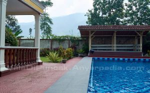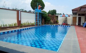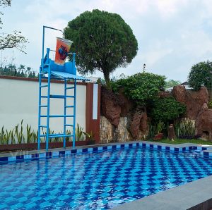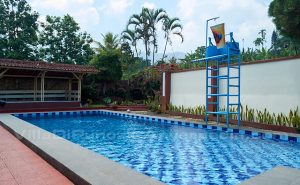 Di sisi teras terdapat kolam renang berukuran besar yang dilengkapi kamar mandi bilas di sisi kolam renang. Di sisi kolam renang juga tersedia gazebo tempat untuk bersantai. Kolam renang di sini sangat bagus dengan pemandangan terbuka dan juga dilengkapi wahana air berupa ember besar di ketinggian yang jika penuh airnya akan tumpah semua ke atas kolam renang. Sangat menyenangkan.