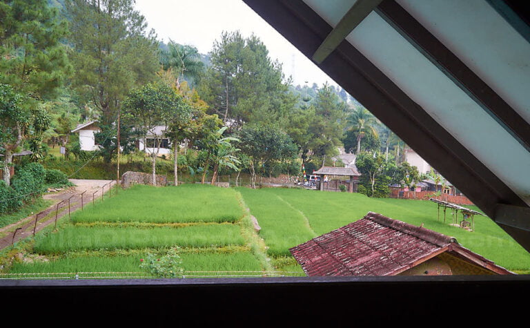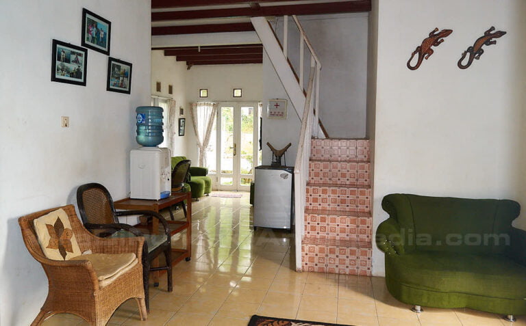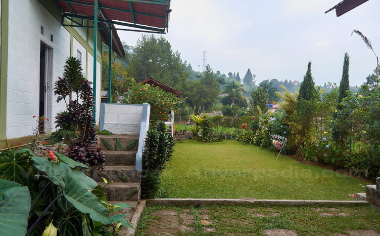 Di sisi bangunan villa terdapat halaman rumput yang sebagian ditumbuhi tanaman-tanaman hias. Di lantai 2 juga terdapat balkon dimana kita dapat bersantai sambil menikmati hamparan sawah.