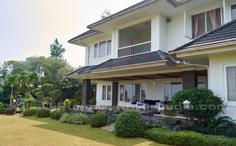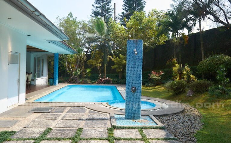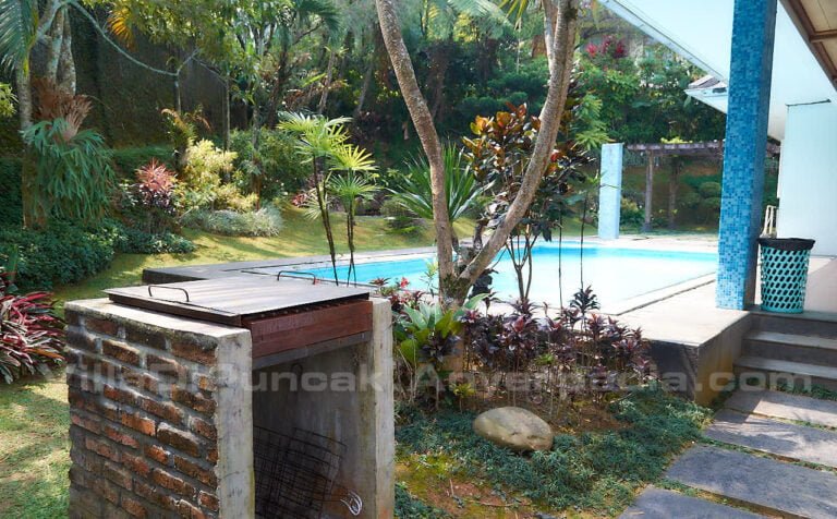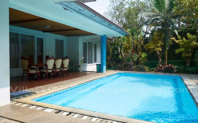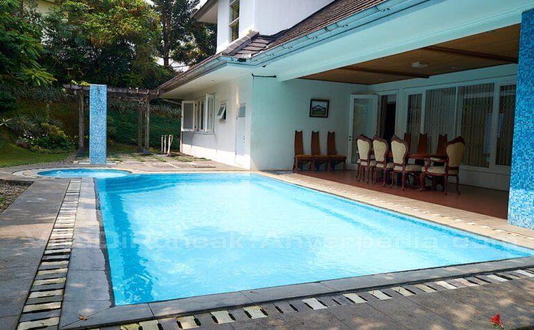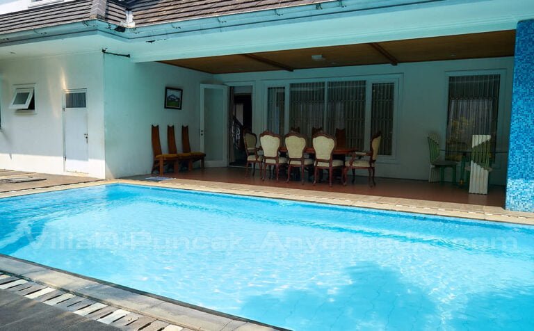 Villa utama memiliki fasilitas kolam renang pribadi yang berada di halaman belakang. Kolam renang ini sangat nyaman karena lokasinya menempel dengan teras belakang serta sisi lain tertutupi tembok dan taman. Sementara di teras depan villa tempatnya nyaman dilengkapi furniture sofa dan meja dimana kita bisa menikmati pemandangan hamparan rumput dan juga pemandangan dari ketinggian. Tersedia juga balkon lantai 2 lengkap dengan furniture.
